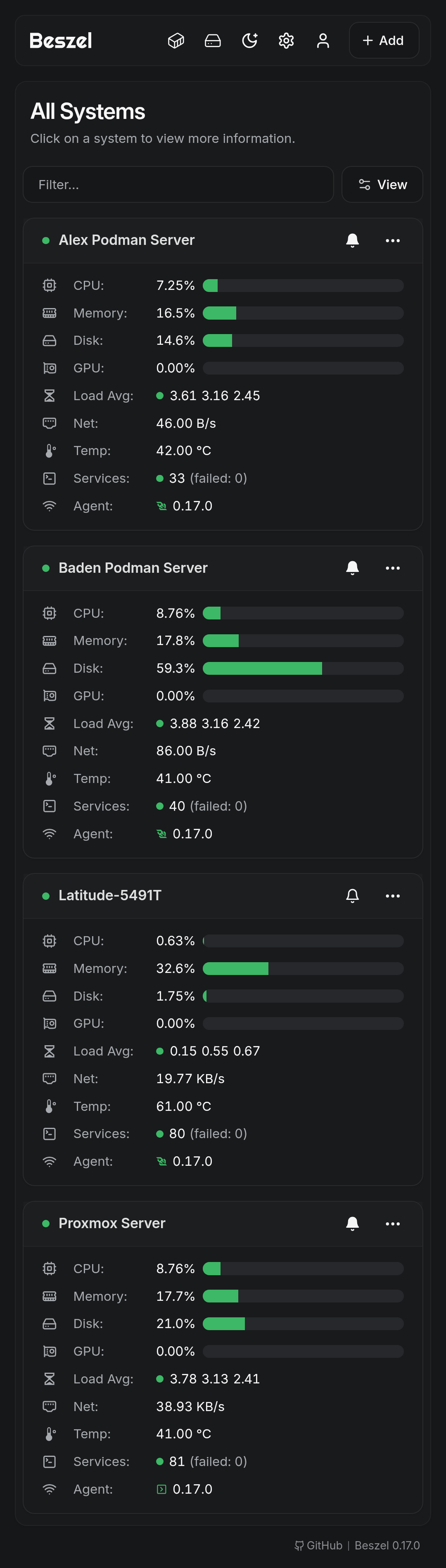- Configure the Beszel Server as soon as you get it running, by adding your hosts. You can recover the token keys easily enough afterwards to deploy your agents